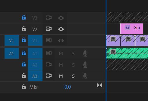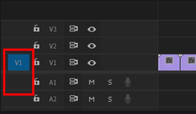 (1) 교차디졸브 (Ctrl + D) 등의 단축키를 적용했을 때, V1이 켜져있기 때문에 인디케이터가 있는 V1 트랙의 영상 클립 사이로 효과가 적용됩니다.